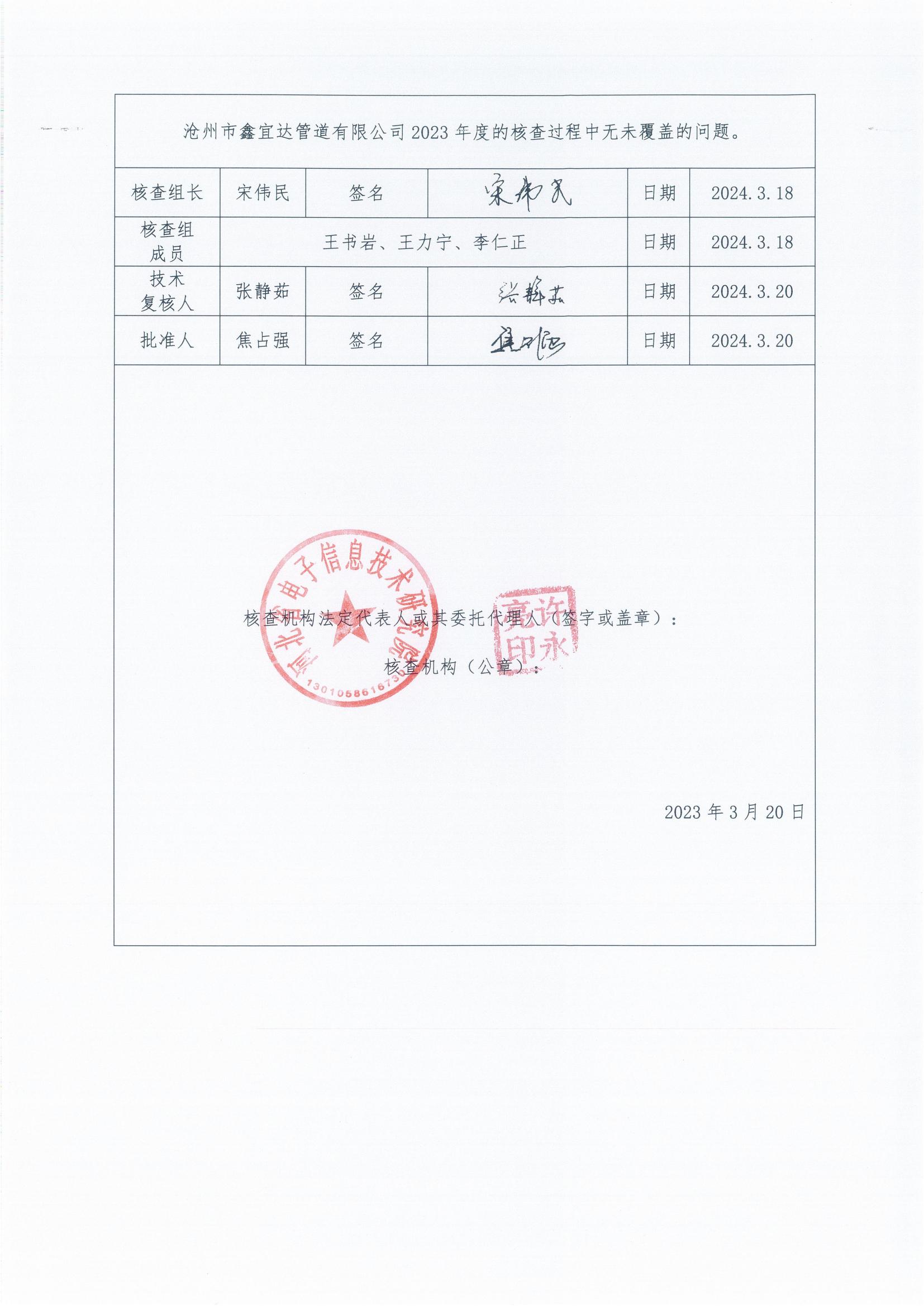 滄州市鑫宜達(dá)管道有限公司2023年度溫室氣體排放核查報(bào)告