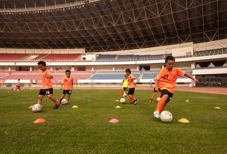 2022年8月16日,綦江区体育中心有不少孩子在参加足球训练。新华网发(重庆市綦江区融媒体中心 杨奇 摄)
