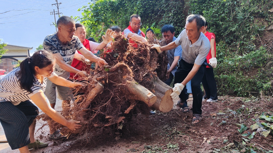 2022年7月8日,綦江区古南街道北渡社区在农贸市场开展“全民清洁日”志愿服务活动,志愿者们齐心协力将大树桩搬运进压缩车。新华网发(重庆市綦江区融媒体中心 周禹 摄)