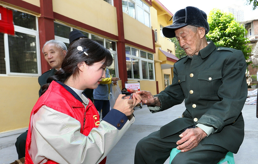 社区党员志愿者为老人们修剪指甲(资料图)。新华网发(重庆市綦江区融媒体中心 杨松 摄)