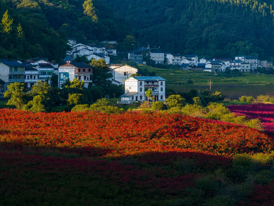 綦江区吹角村的紫薇花开时,粉红的,深红的,一大片一大片,装点着村庄,美化着乡村(资料图)。新华网发(重庆市綦江区融媒体中心 吴先勇 摄)