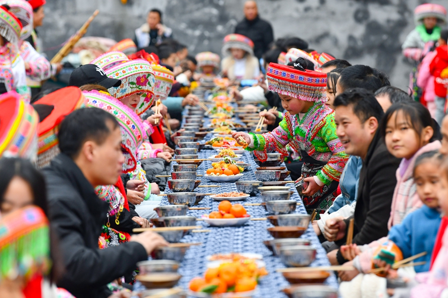 綦江区赶水镇,乡亲们围坐在一起吃“长桌宴”(资料图)。(中共重庆市綦江区委宣传部供图)