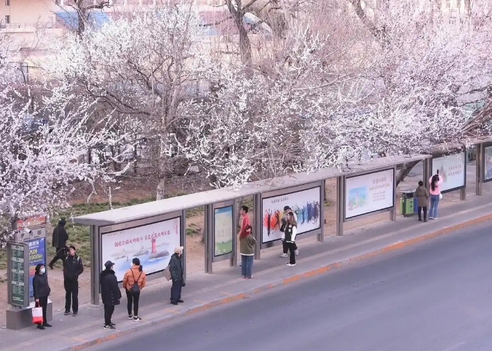 “最美公交站”——大连市西南路黄河桥站成为网红打卡地。(图片来源:大连市文明办)